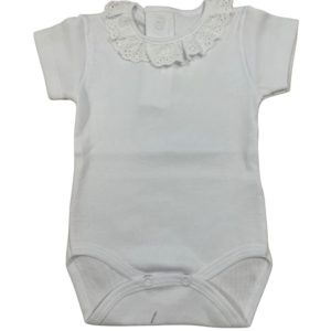 Este body destaca por su confección en 100% algodón, un material suave y transpirable que protege la piel del bebé. Gracias a su tejido de alta calidad, ofrece una sensación agradable y evita irritaciones. Además, su color blanco lo convierte en una prenda versátil, fácil de combinar con cualquier conjunto.